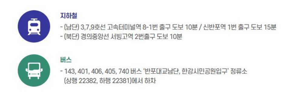 잠수교 뚜벅뚜벅 축제에서는 대중교토 이용하시는 걸 추천드립니다. 주변에 마련된 주차장이 없고, 있던 주차장도 행사장으로 쓰이고 있기 때문에 지하철이나 버스를 타고 약 5분 정도 걸어가시면 잠수교 뚜벅뚜벅 축제를 즐기실 수 있습니다. 그래도 차를 가지고 가야겠다 하시는 분들을 위해 그나마 가까운 주차장 안내를 해드리겠습니다.