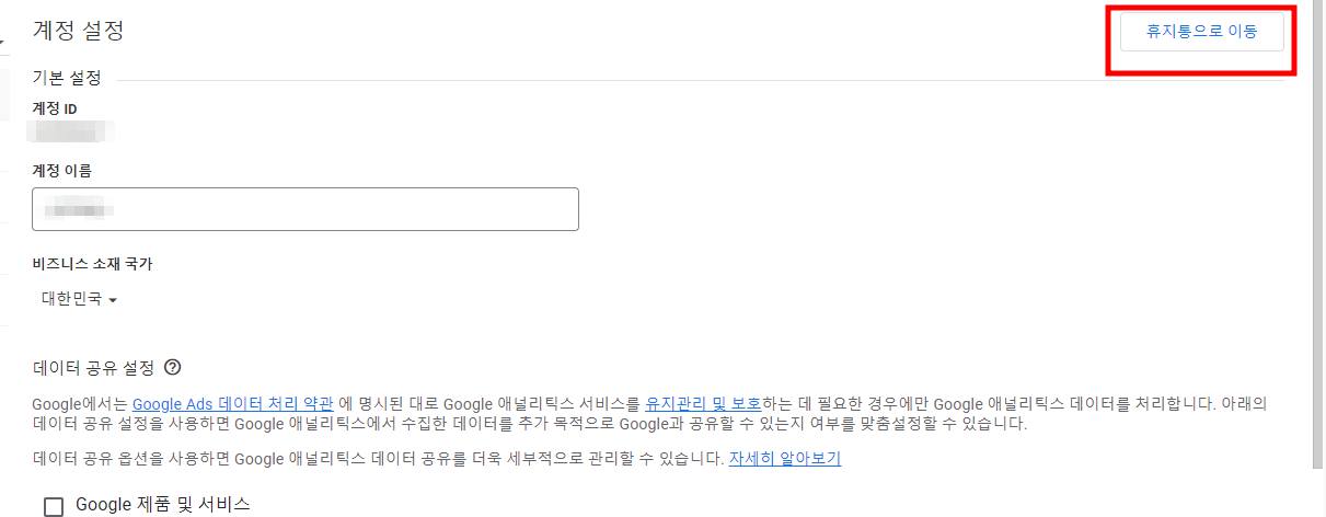 애널리틱스 계정 설정에 들어오셨다면 계정 이름을 확인해 주세요. 열심히 고생해서 등록한 멀쩡한 계정을 지우면 슬플 테니까요. 지금까지 했던 몇 시간의 노력이 헛수고가 될 수 있습니다. 애널리틱스 삭제할 계정이름을 확인하셨다면 우측상단에 휴지통으로 이동 버튼이 있습니다. 눌러주세요.