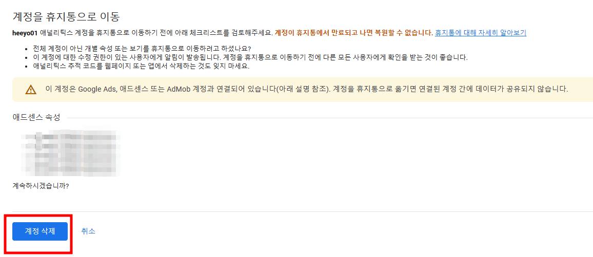 마지막으로 애드센스 속성을 확인하시고(내 애드센스 계정 펍코드가 보입니다.) 계정삭제를 눌러주세요. 그럼 구글 애널리틱스 계정이 삭제됩니다.