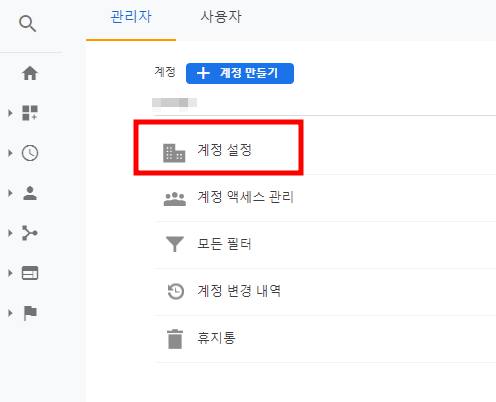구글 애널리틱스 홈페이지로 들어갑니다. 왼쪽 하단에 톱니바퀴 관리 버튼을 눌러줍니다. 그다음에 나타나는 계정 설정을 눌러줍니다.